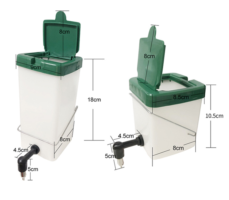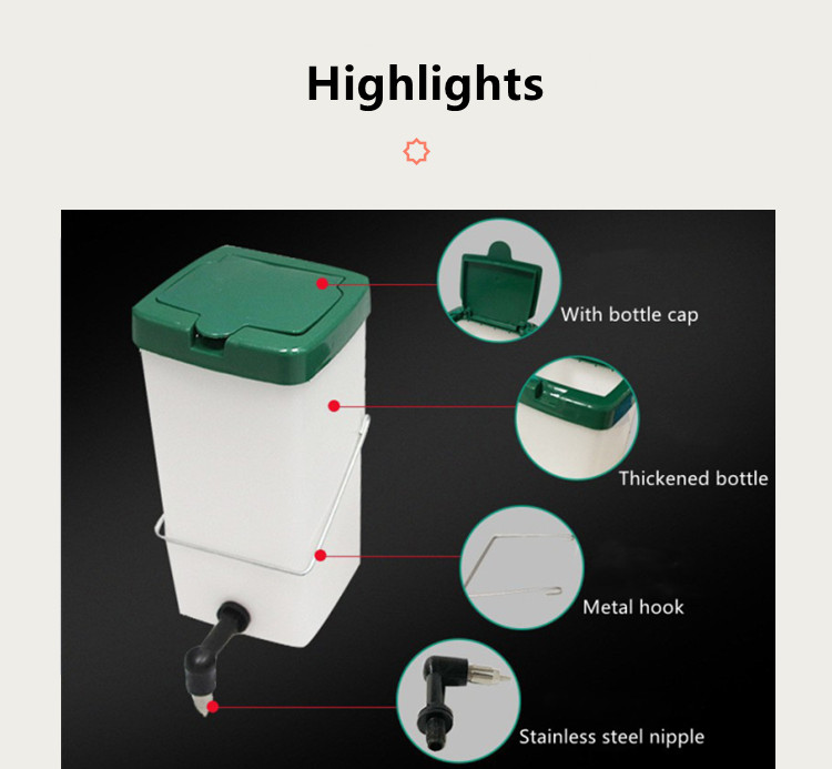 The bottle is made of plastic (pp) and the nipple holder of a very strong plastic. The stainless steel nipple rotated in this case has a very long lifespan. Leakage can not actually occur, but if this happens, 99% of all cases of nipple pollution will occur. Cleaning with vinegar, for example, works perfectly. The bottle has a square lid that is detachable to clean the bottle. On this lid is a round white filling pad or flap lid, which is used to fill the bottle. The bottle is supplied including a galvanized bracket for attaching the bottle to the mesh.
